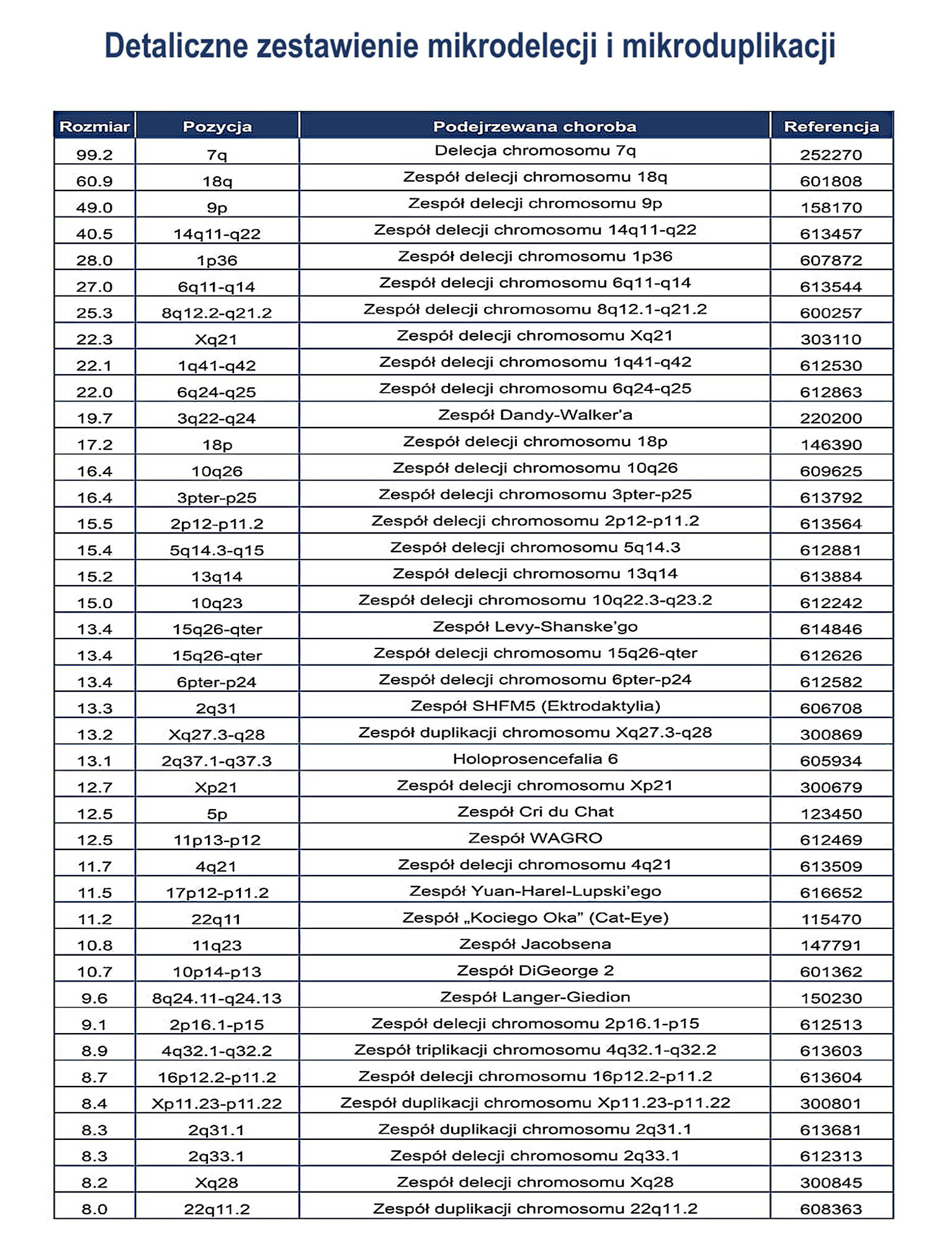 Poza powszechnymi aneuploidiami chromosomów T21, T18, T13, zespoły mikrodelecji / powielania chromosomów (zwane również zmianami liczby kopii chromosomalnych, CNV) mogą również powodować poważne wady wrodzone i problemy zdrowotne. Częstość występowania tych stanów mieści się w zakresie od 1/4000 do 1/200 000, z rozmiarem od 100K do ponad 10M. Niektóre z nich mają nawet wyższą częstość występowania niż Trisomia 13, takie jak zespół DiGeorge’a, który wynika z niewielkiej części delecji na chromosomie 22. Dla kobiet w ciąży poniżej 40-go roku życia prawdopodobieństwo, że zostaną dotknięte przez mikrodelecje, jest nawet większe niż zespołu Downa.